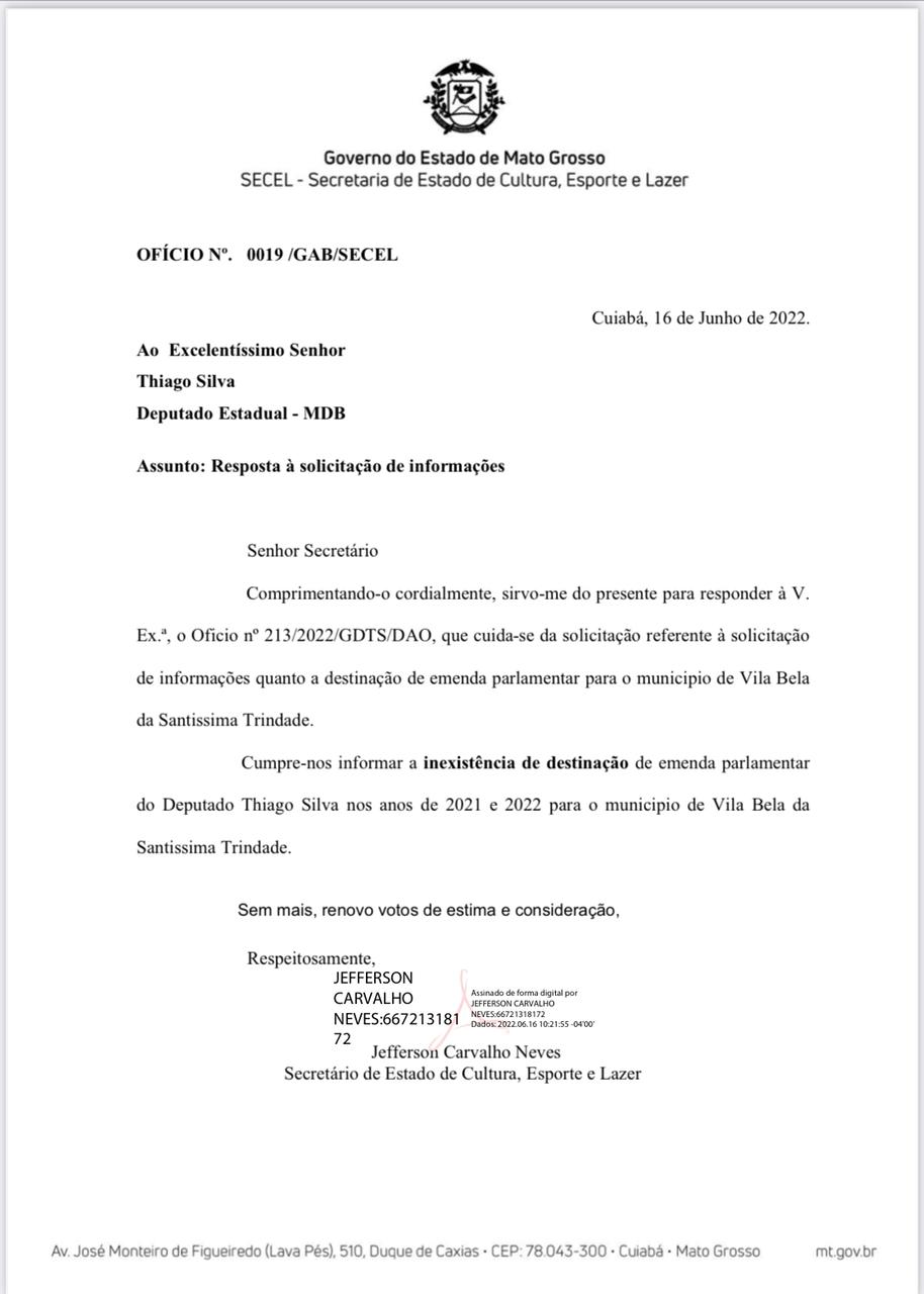 Perante o fato, a Secretaria Estadual de Cultura informou a inexistência de destinação de emenda parlamentar do deputado Thiago, entre os anos de 2021 a 2022, como, também, o prefeito André que se reconsiderou sobre as declarações feitas que prejudicaram erroneamente o parlamentar estadual.